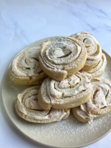 5. לוקחים 2 קערות קטנות – באחת שמים סוכר ובשנייה אבקת סוכר ומחלקים את הבצק לכדורים. (אני עשיתי כל כדור 25 גרם), מגלגלים בסוכר ואז באבקת סוכר ומניחים על תבנית עם נייר אפייה ואופים כ-8 דק בלבד!