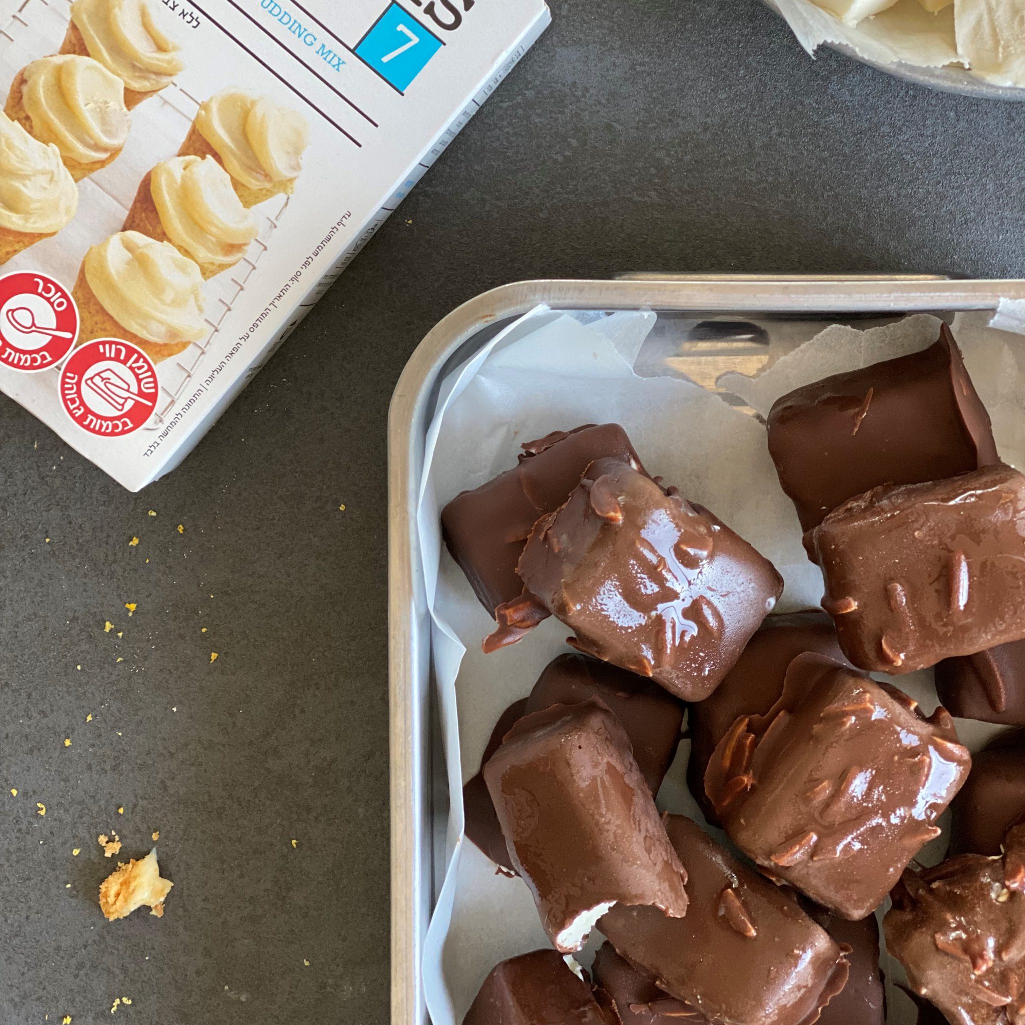 את המלבנים מסדרים בתבנית ומחזירים שוב להקפאה לשעה.